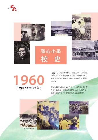 32 聖心小學 校史 1960 第 中,實踐會祖的理想。聖心小學於民國 54 1 任校長孫知微修女,就在這一片好山好水 年由天主教聖心會修女創校,於隔年立案並設立 幼兒園。 ( 民國 54 至 59 年 ) 第 1 年招收 1 班共 39 位學生,多國籍修女協助教 學及生活輔導,營造國際視野及自由、友善學風。 民國 58-60 年由余玉雲老師代理校長綜理校務。 第 1 屆幼兒園學生