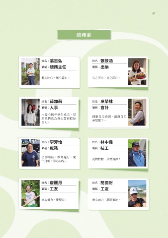87 總務處 姓名:翁志弘 姓名:張筱涵 職稱:總務主任 職稱:出納 將心比心,用心盡心。 心之所向,身之所往。 姓名:薛加莉 姓名:吳榮林 職稱:人事 職稱:會計 用愛心陪伴學生成長,幫 細數每分資源,灌溉每位 助他們成為身心靈都健康 夢想種子。 的人。 姓名:李芳怡 姓名:林中偉 職稱:庶務 職稱:技工 信仰領航,教育遠行,愛 愛物惜物,珍惜資源! 作舟帆,育心向光。 姓名:詹麗月 姓名:簡國財 職稱:工友 職稱:工友 盡心盡力,愛聖心! 盡心盡力,腳踏實地。