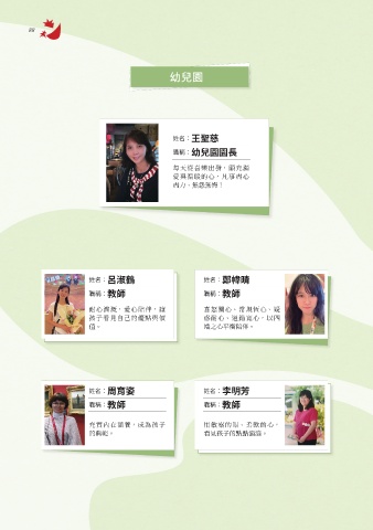 88 幼兒園 姓名:王聖慈 職稱:幼兒園園長 每天從喜樂出發,願充滿 愛與溫暖的心,凡事盡心 盡力、無怨無悔! 姓名:呂淑鶴 姓名:鄭幃晴 職稱:教師 職稱:教師 耐心灌溉,愛心陪伴,讓 喜怒關心、常規恆心、疑 孩子看見自己的優點與價 惑耐心、過錯寬心,以四 值。 端之心平衡陪伴。 姓名:周育姿 姓名:李明芳 職稱:教師 職稱:教師 充實內在涵養,成為孩子 用敏察的眼、柔軟的心, 的典範。 看見孩子的點點滴滴。