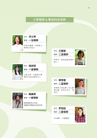 91 小學導師 & 專任科任老師 姓名:洪士婷 職稱:一信導師 用柔和態度,正向語言, 陪伴孩子成長。 姓名:王蘭斐 職稱:二信導師 和學生一起成為越來越好 的人。 姓名:陸佩琪 職稱:一望導師 以愛為根,以智慧為翼, 教孩子成為更好的自己 姓名:鄭雪雲 職稱:二望導師 每個孩子都是寶,用心教 導打造,即使只為了一個 孩子! 姓名:賴美華 職稱:一愛導師 懷抱耶穌聖心的愛, 做讓世界變得更美好的事。 姓名:李鈺紋 職稱:二愛導師 以心體心,以愛還愛。